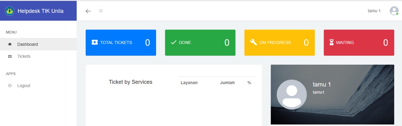 Status ticket menunggu, apabila sudah di kerjakan status sudah dikerjakan dan pemberitahuan dikirim melalui email aktif yang digunakan pada saat mengisikan form ticket.Untuk Pengaduan ( Jaringan Internet, SIAKADU, Website, Sistem Informasi, Lainnya ), silahkan ikuti panduan berikut:1. Silahkan log in menggunakan Username dan Password SSO kemudian tekan tombol Sign in. 2. Tampilan Dashboard pengguna 3. Tekan Tombol Tickets, untuk membuat ticket layanan tekan Buat Ticket